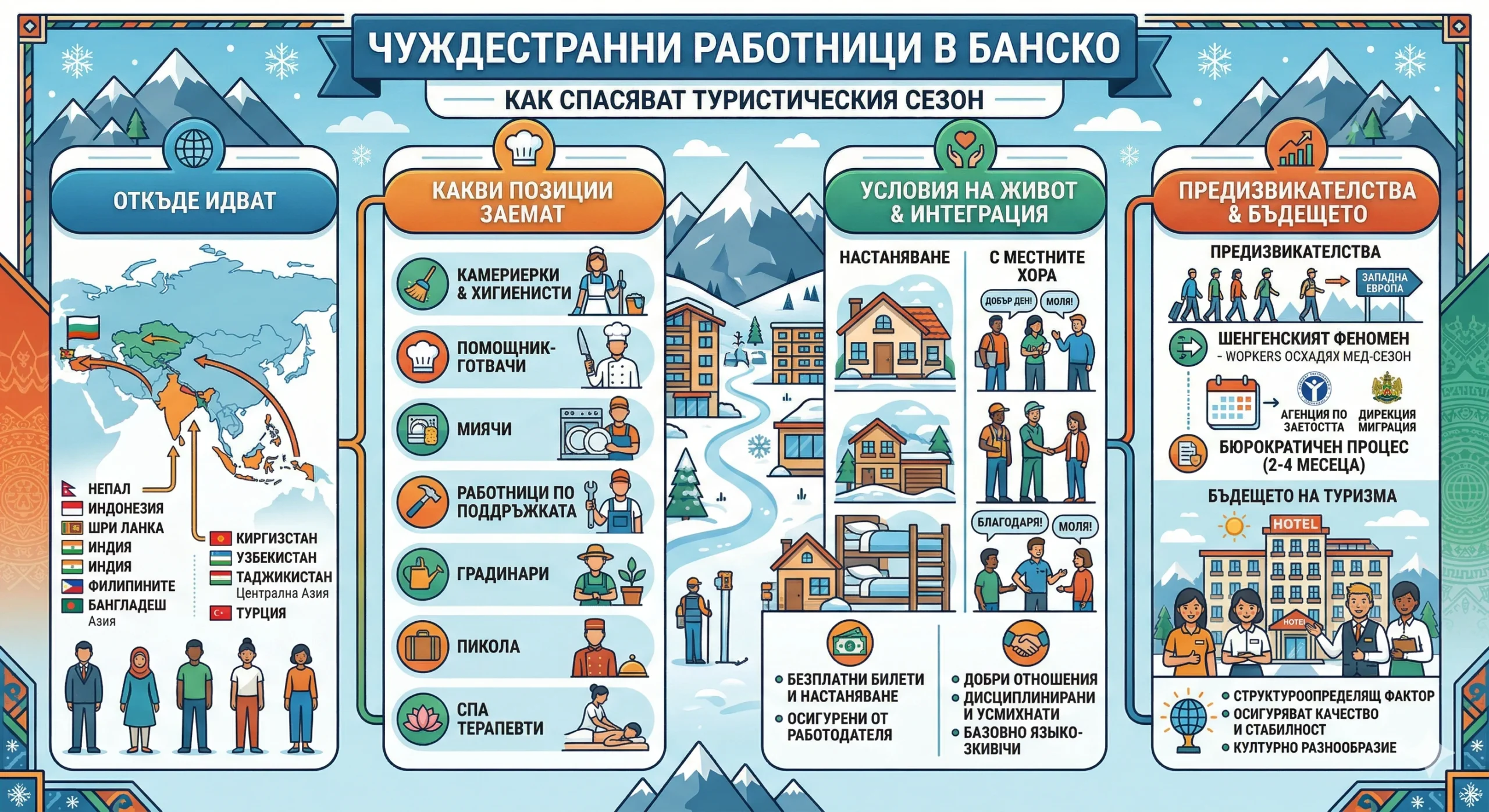 Изчерпателна инфографика, която илюстрира жизненоважната роля на чуждестранните работници в Банско за поддържането на туристическия сезон. Тя обхваща техния географски произход, позициите, които заемат, техните условия на живот и интеграция в местната общност, както и предизвикателствата и перспективите пред сектора.