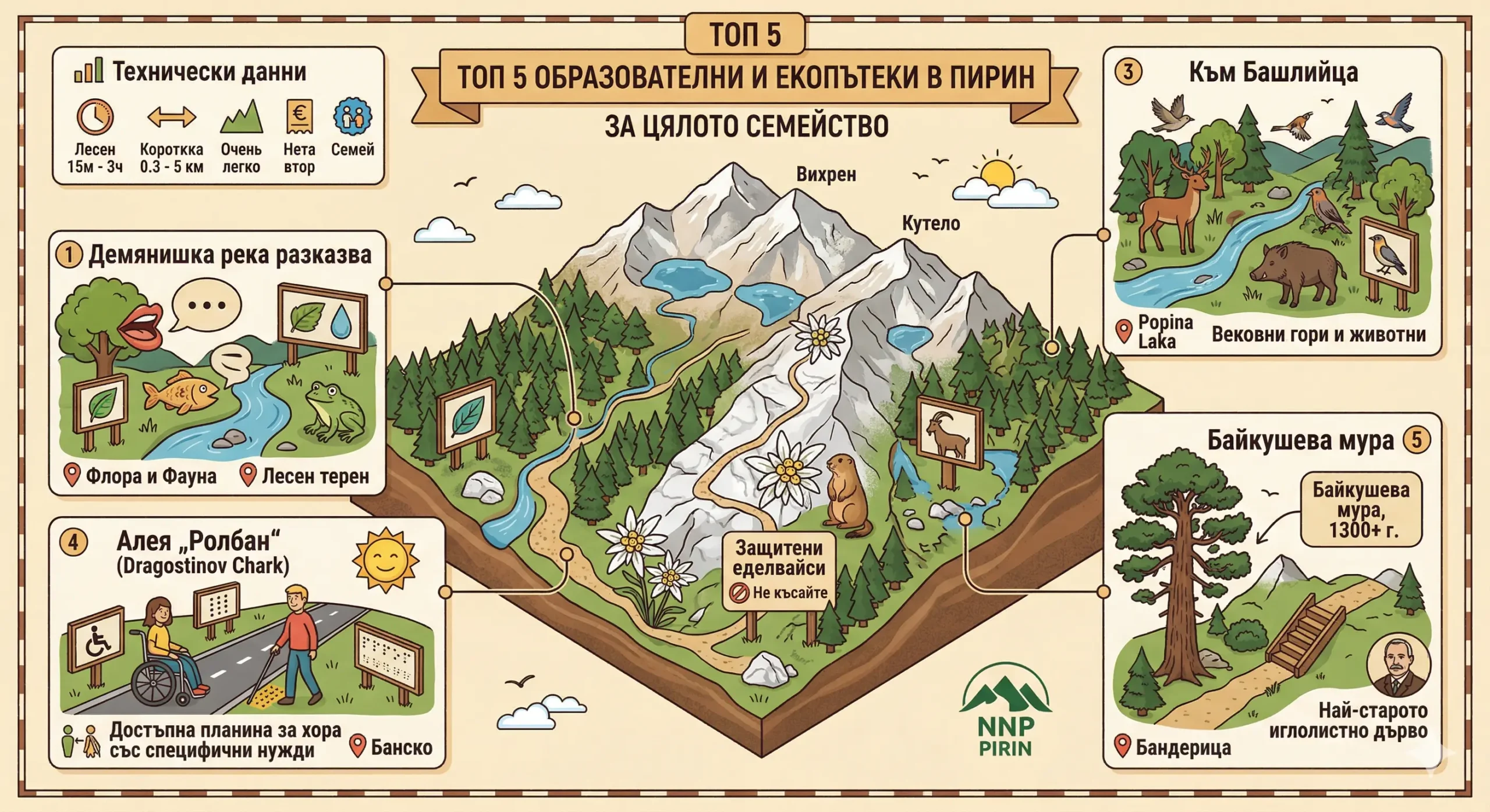This illustrative isometric infographic presents the 5 best educational eco-trails in Pirin, specially designed for the whole family. It includes technical data such as Easy difficulty and short times (15m – 3h), as well as detailed descriptions and locations for each trail, such as Baykusheva mura (the oldest tree, 1300+ years old), the accessible Rolban alley, Kum Bashliytsa (for deer and wild boar), Demyanishka Reka Rastra (for flora and fauna) and Protected Edelweiss. The routes are clearly marked on a map of Pirin, including Vihren and Kutelo.