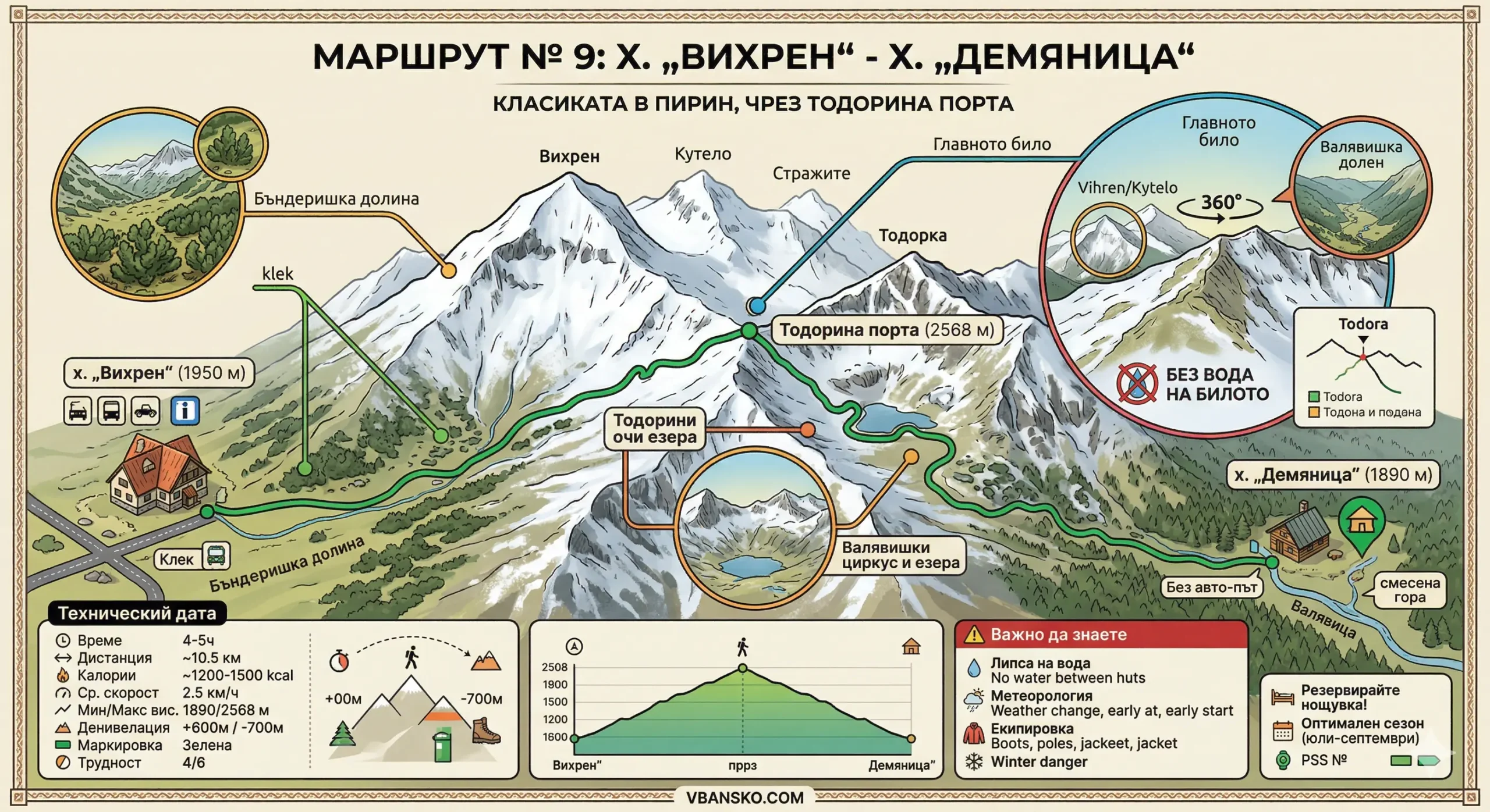 Map of the popular high-mountain Route No. 9 (10.5 km, 4–5 h, +600 m elevation gain) with green markings, connecting the Vihren and Demyanitsa huts via Todora Gate (2568 m), Valyavishki Lakes and Banderishka Valley