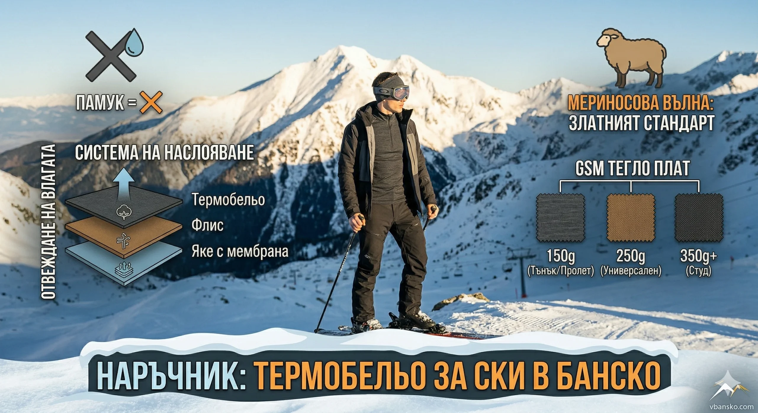 Този експертен визуален наръчник обяснява критичното значение на базовия слой (термобельо) за ски екипировката в Банско. Илюстрирано на фона на връх Тодорка, изображението показва защо памукът е забранен, системата на наслояване на облекло за отвеждане на влагата, предимствата на мериносовата вълна като златен стандарт и как да изберете правилното GSM тегло плат за планински комфорт, независимо от метеорологичните условия.