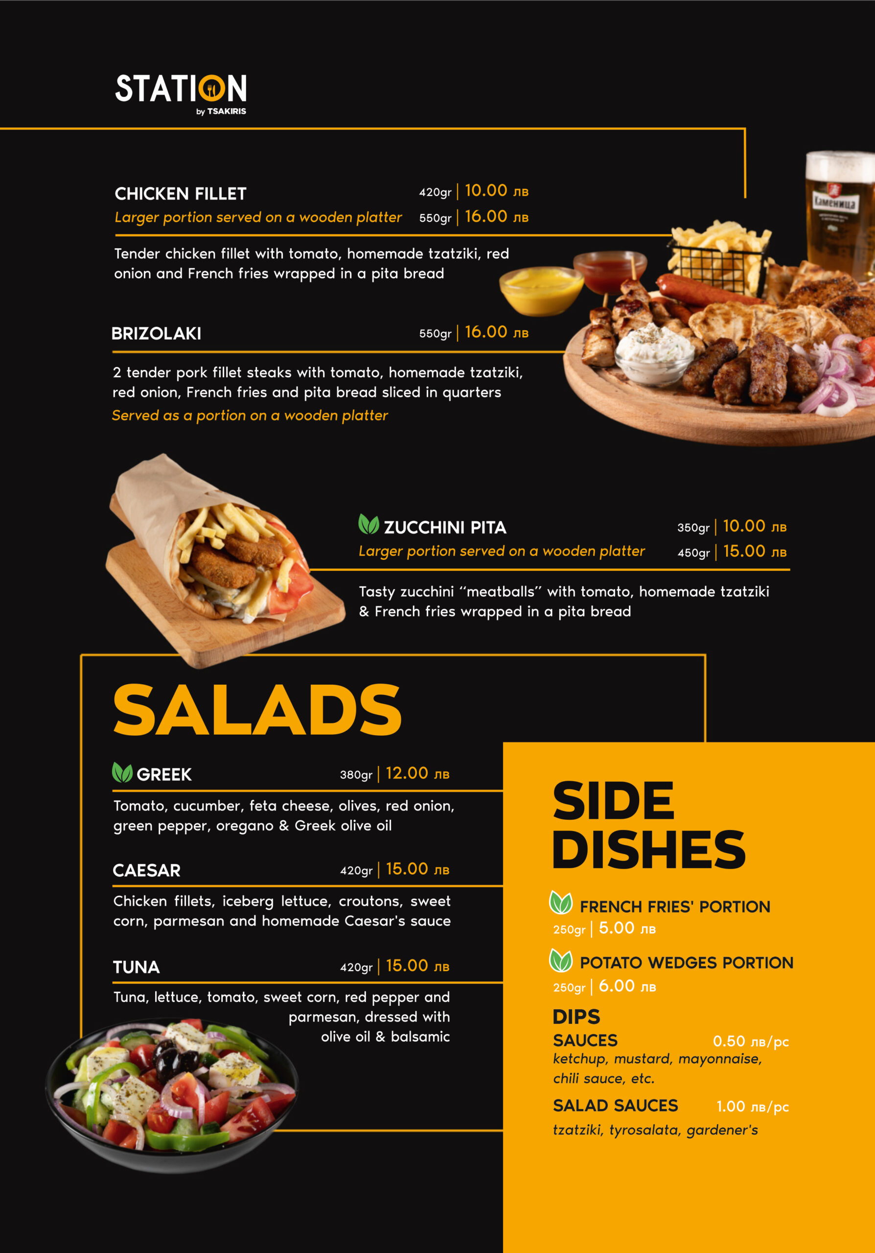 Сред най-популярните предложения са класическото гръцко гиро, поднесено в мека пита с месо по избор, свежи зеленчуци и ароматен сос дзадзики. Любителите на месни специалитети могат да опитат сувлаки от свинско, пилешко или агнешко, приготвяно на грил и овкусено с оригинални подправки от Гърция. Менюто включва също бургери в гръцки стил, при които месото и хлебчето се допълват от свежи зеленчуци и специални домашни сосове.