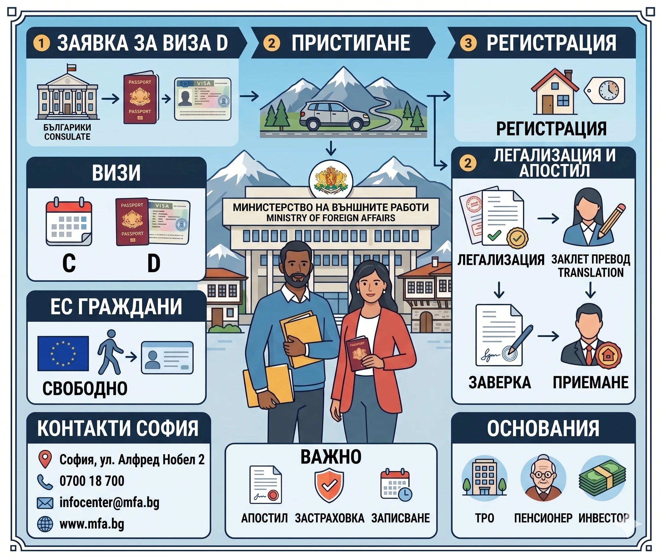 Изчерпателна инфографика на български език, илюстрираща стъпките за получаване на виза D, пристигане и регистрация в България за чужденци. В центъра са мъж и жена пред сградата на Министерството на външните работи. Включва раздели за видове визи, права на ЕС граждани, контакти, легализация, основания за пребиваване и важни изисквания.