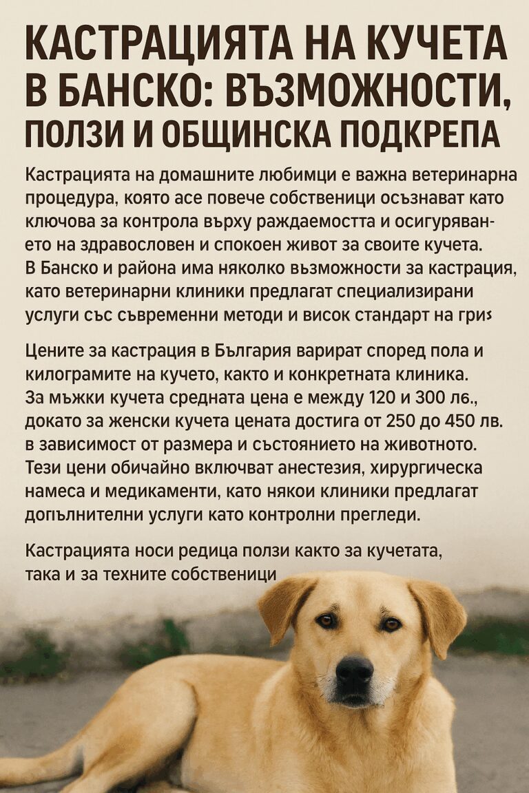 Това е пълен текст за статията с подходящо заглавие, който обхваща възможностите за кастрация, наличните клиники, цените, ползите и общинската подкрепа като ежегодни кампании в Банско. Ако трябва, може да се доразвие или оформи специфично
